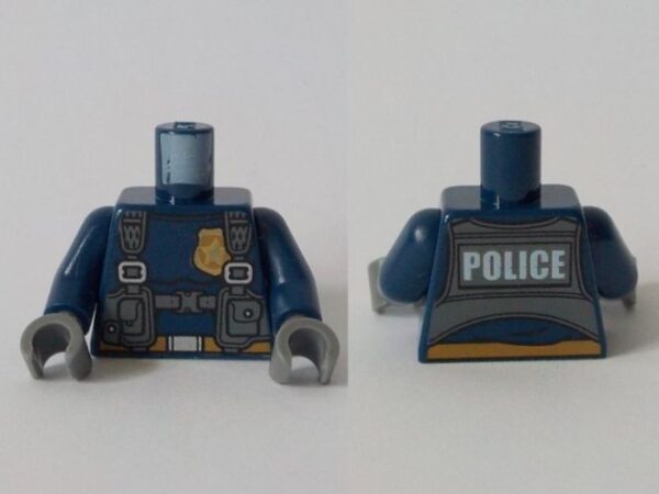 973pb3567c01 – Torso Police with Harness, Gold Star Badge Logo, Belt and 'POLICE' on Back Pattern / Dark Blue Arms / Dark Bluish Gray Hands
