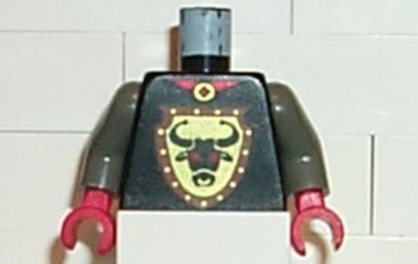 973px120c01 – Torso Castle Knights Kingdom Bull’s Head on Brown Shield Pattern / Dark Gray Arms / Red Hands